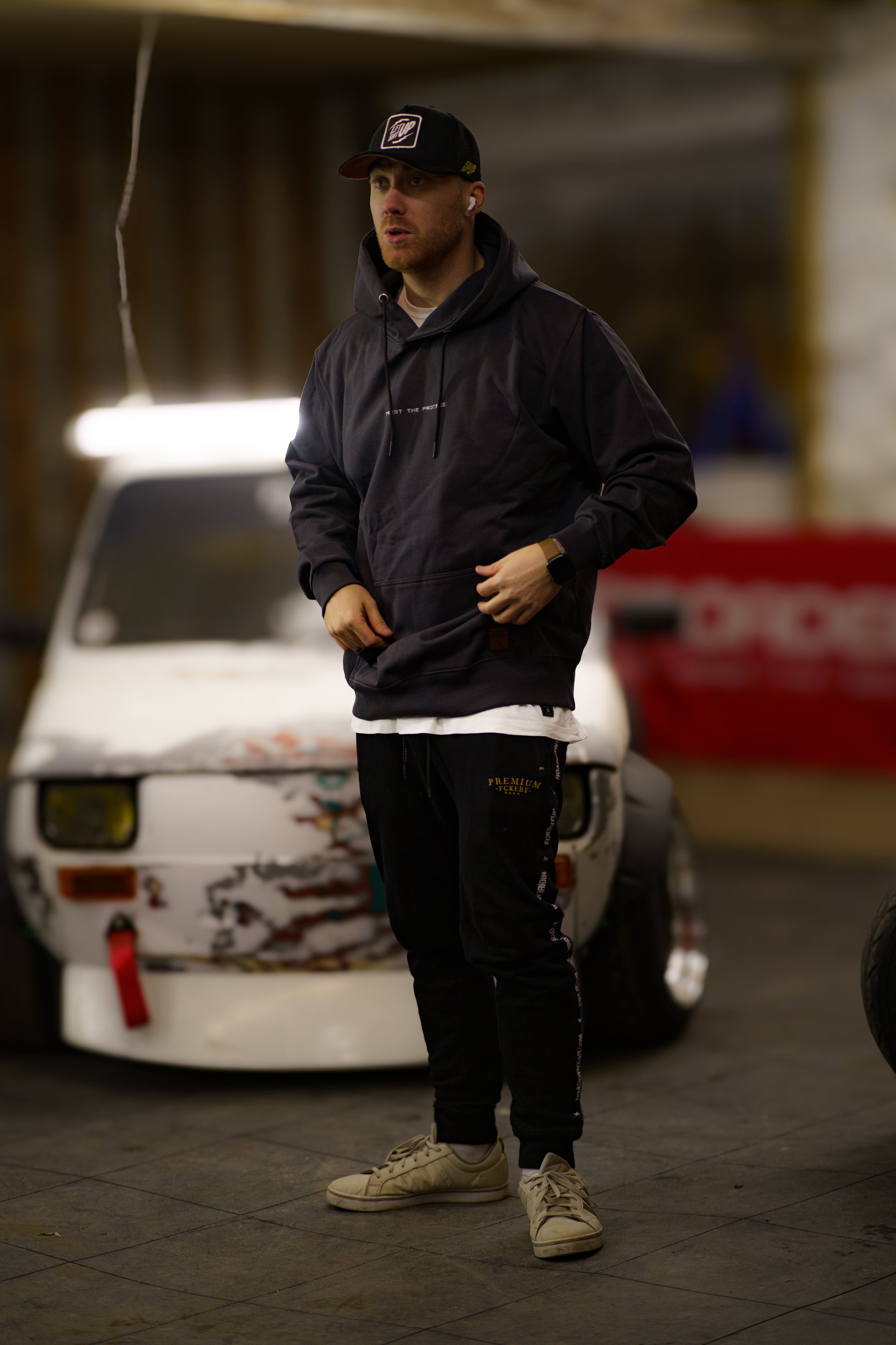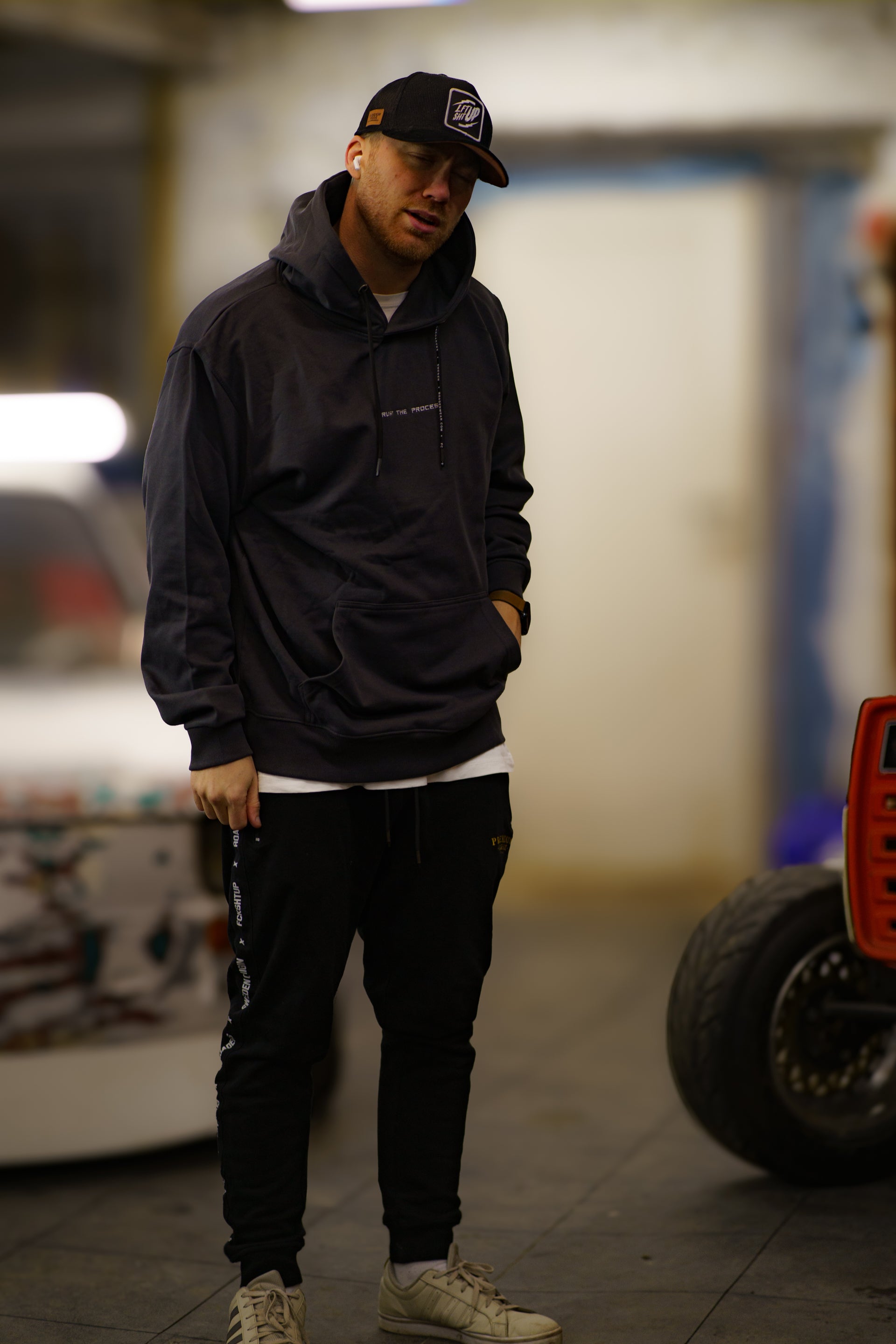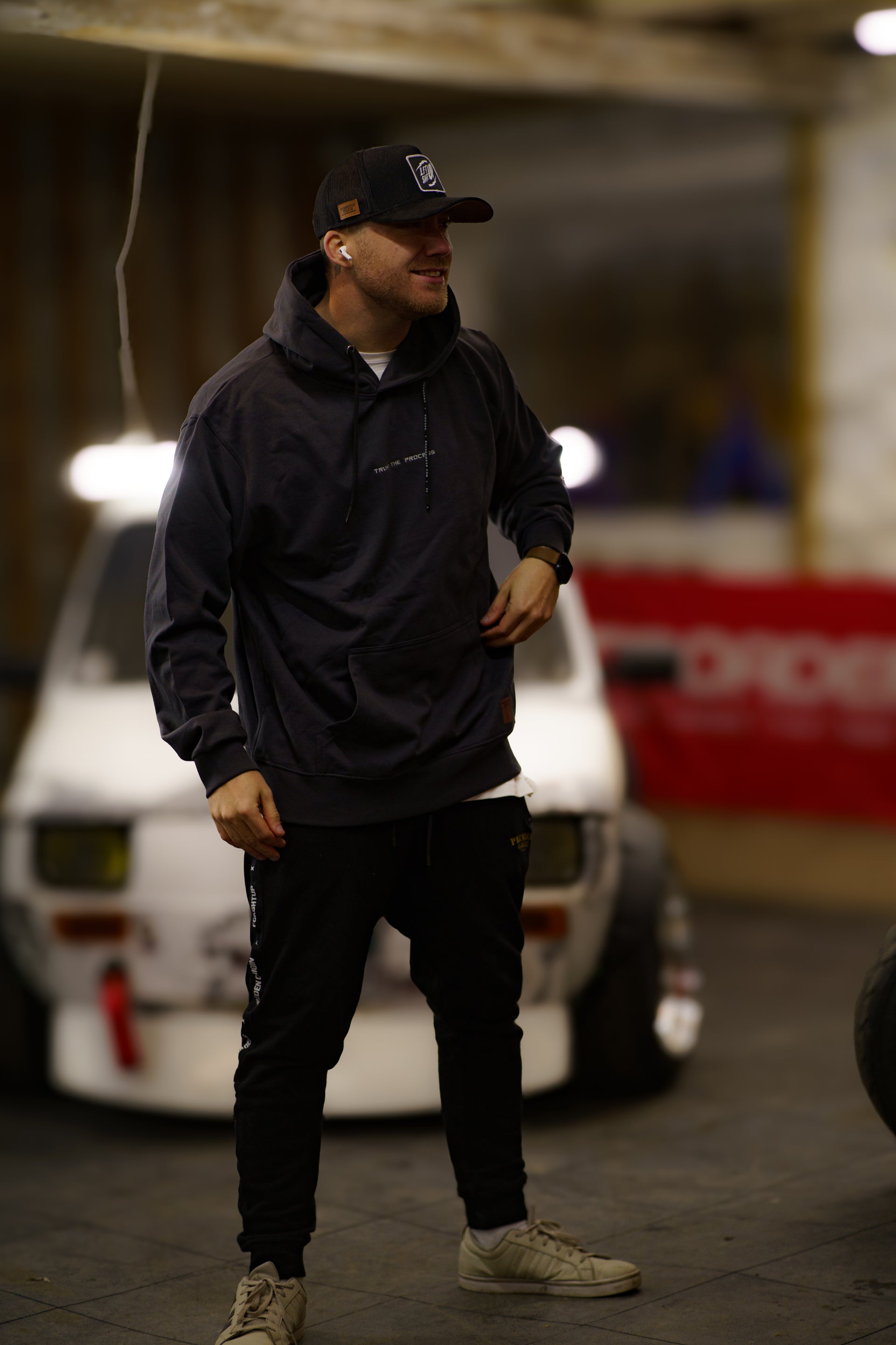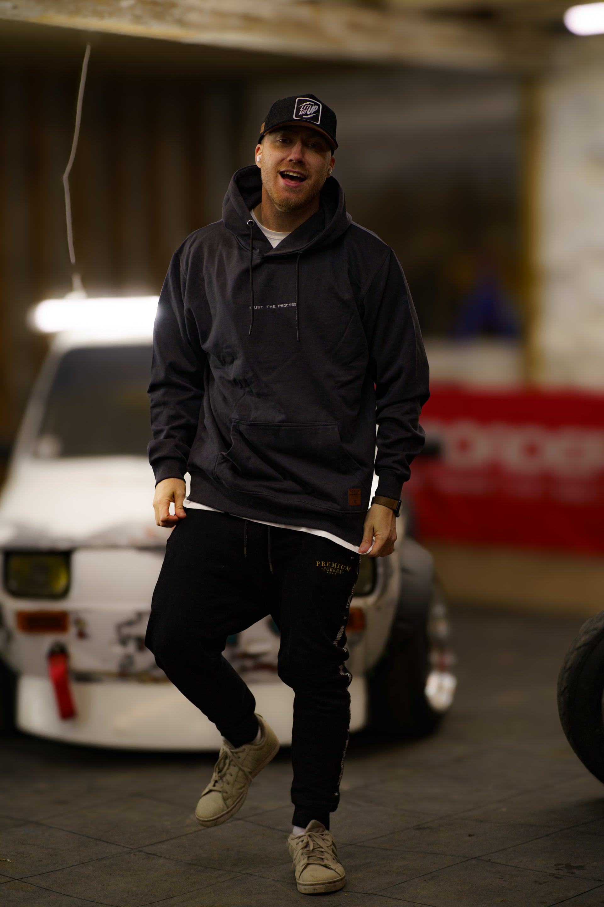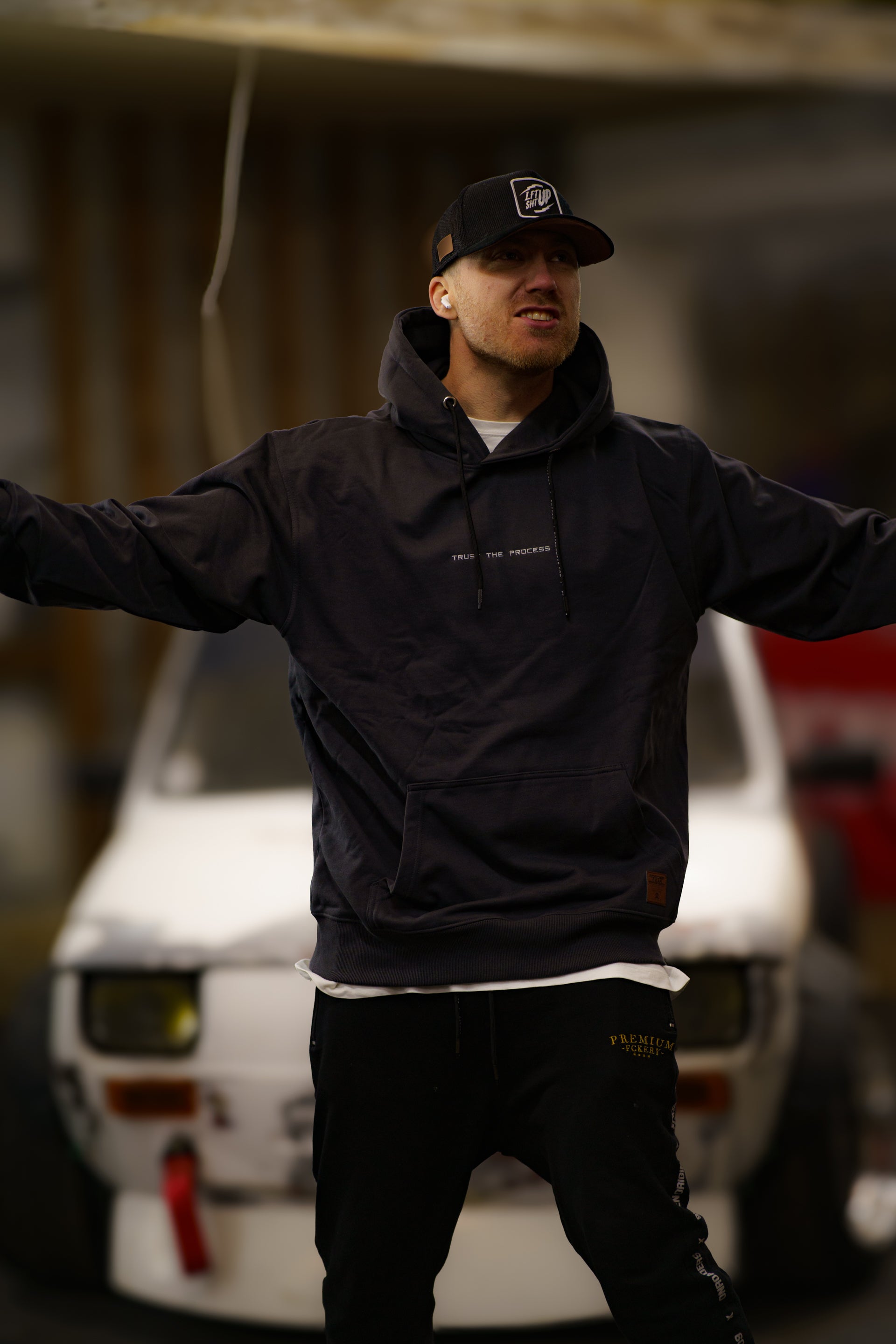Introducing the Dark Grey Colored TRUST THE PROCESS Hoodie: Where Cars, Friends, and the Journey Collide in Style!