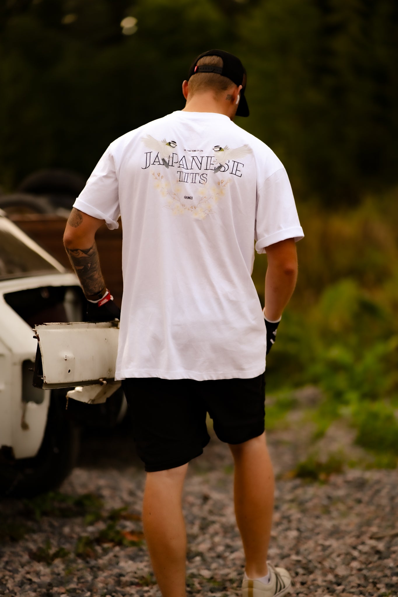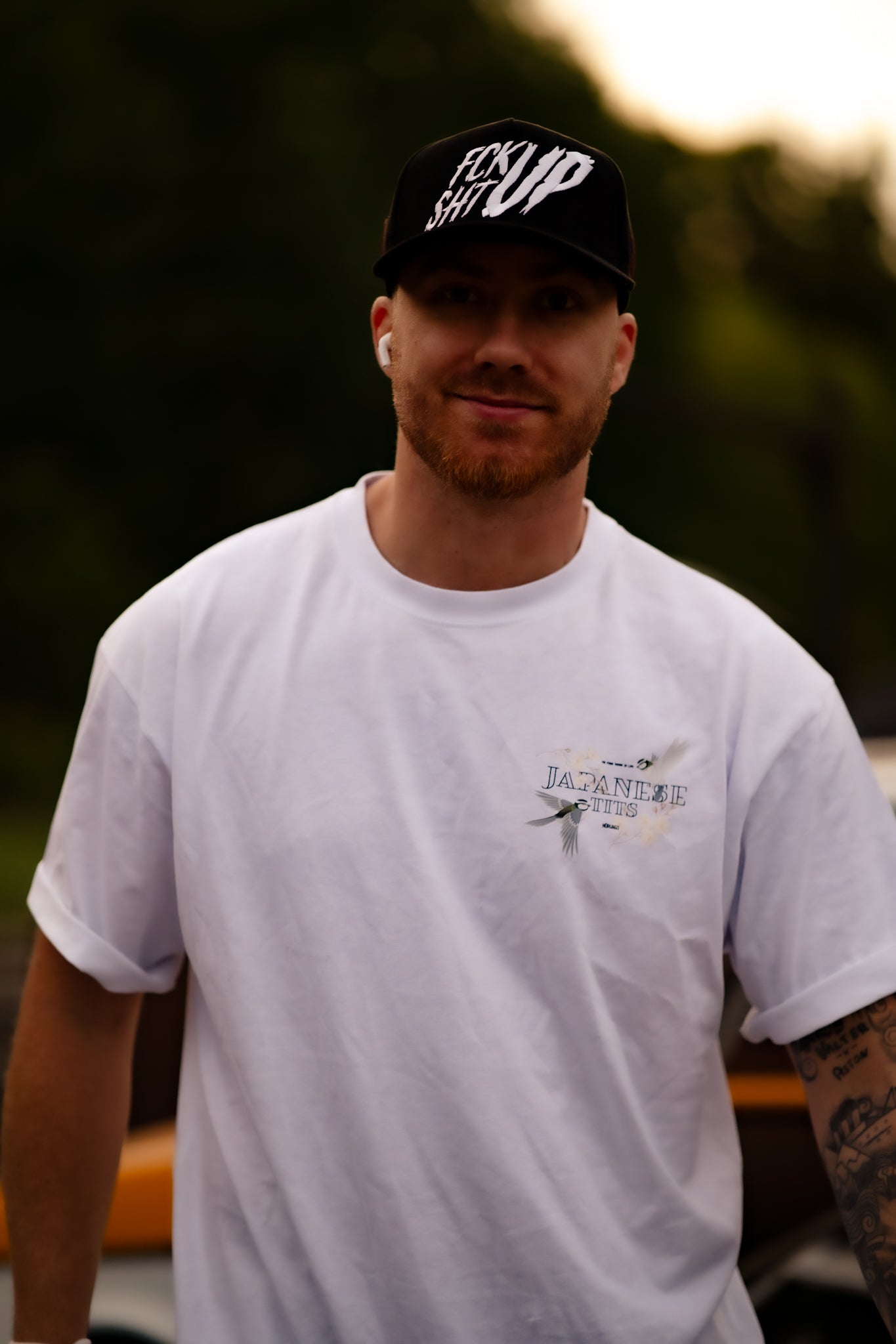 Med ett flerfärgat tryck på bröstet och ett stort flerfärgat tryck på ryggen är vår HÜRUNG3 Signatur Japanese Tits T-shirt det ultimata uttrycket för din unika stil och attityd. På bröstet och ryggen pryds T-shirten av två vita fåglar, blommor, och texten "Japanese Tits" samt "The Finer Things in Life" ovanför.