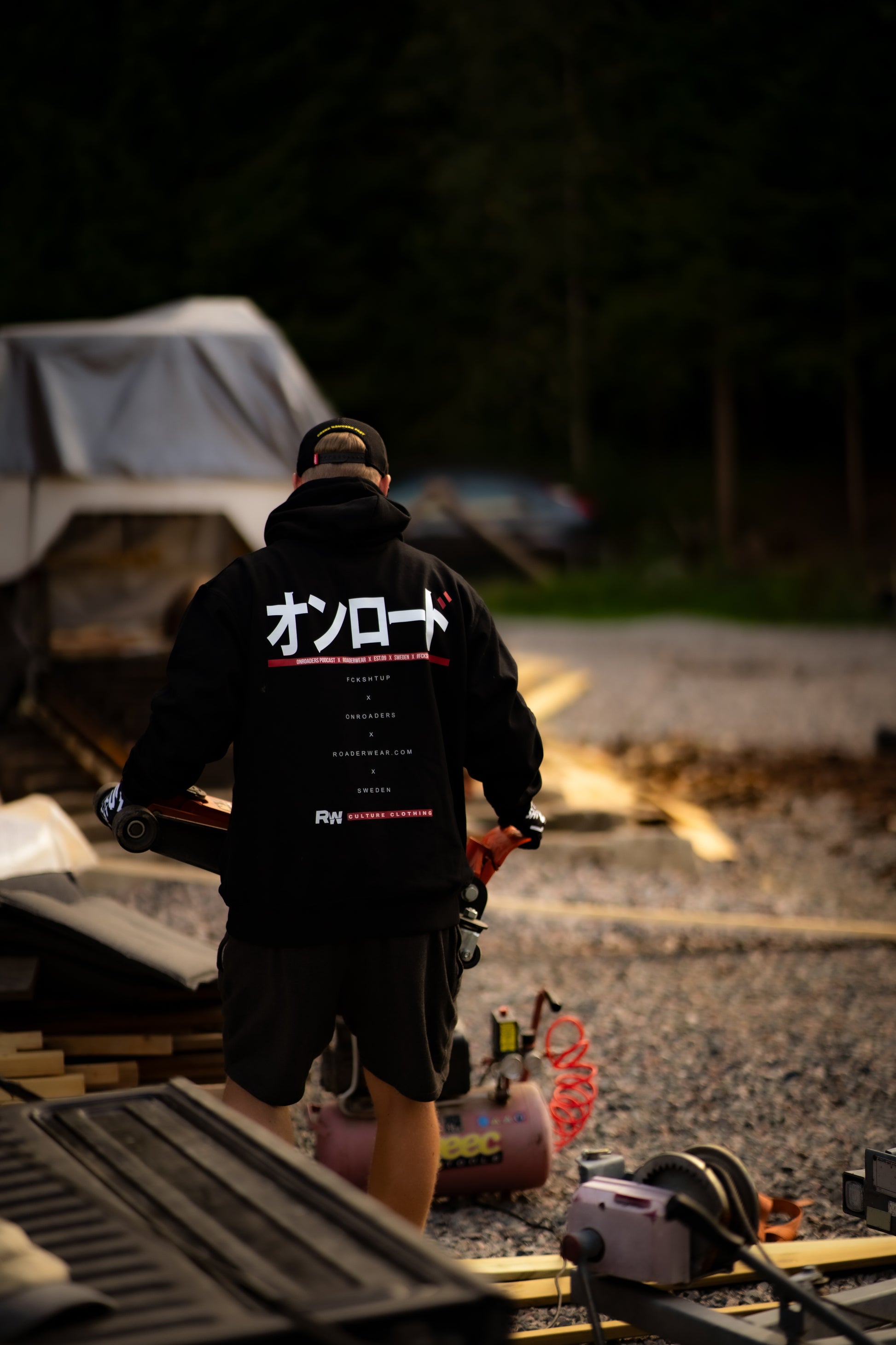 Kicka igång din stil med vår Onroaders Classic Hoodie – en svart hoodie som är lika ikonisk som den är bekväm. Med den rödvita Onroaders-loggan på bröstet och det stora ryggtrycket med vår klassiska japanska logga, är detta plagget som verkligen sticker ut.