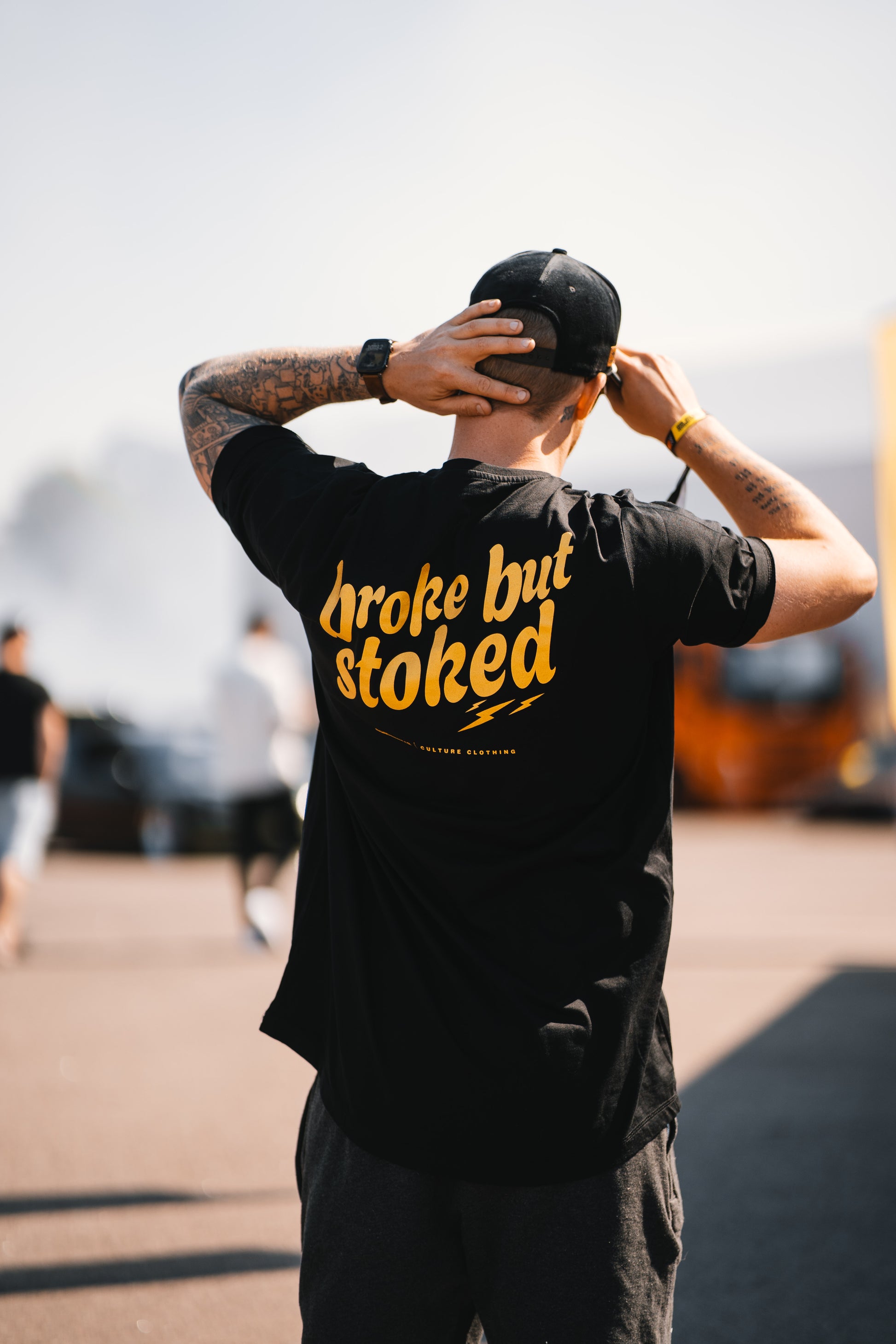 Med "shitbox" tryckt i metallicguld på bröstet och "broke but stoked" i matchande stil på ryggen är det här tröjan för dig som lever low budget, high revs.