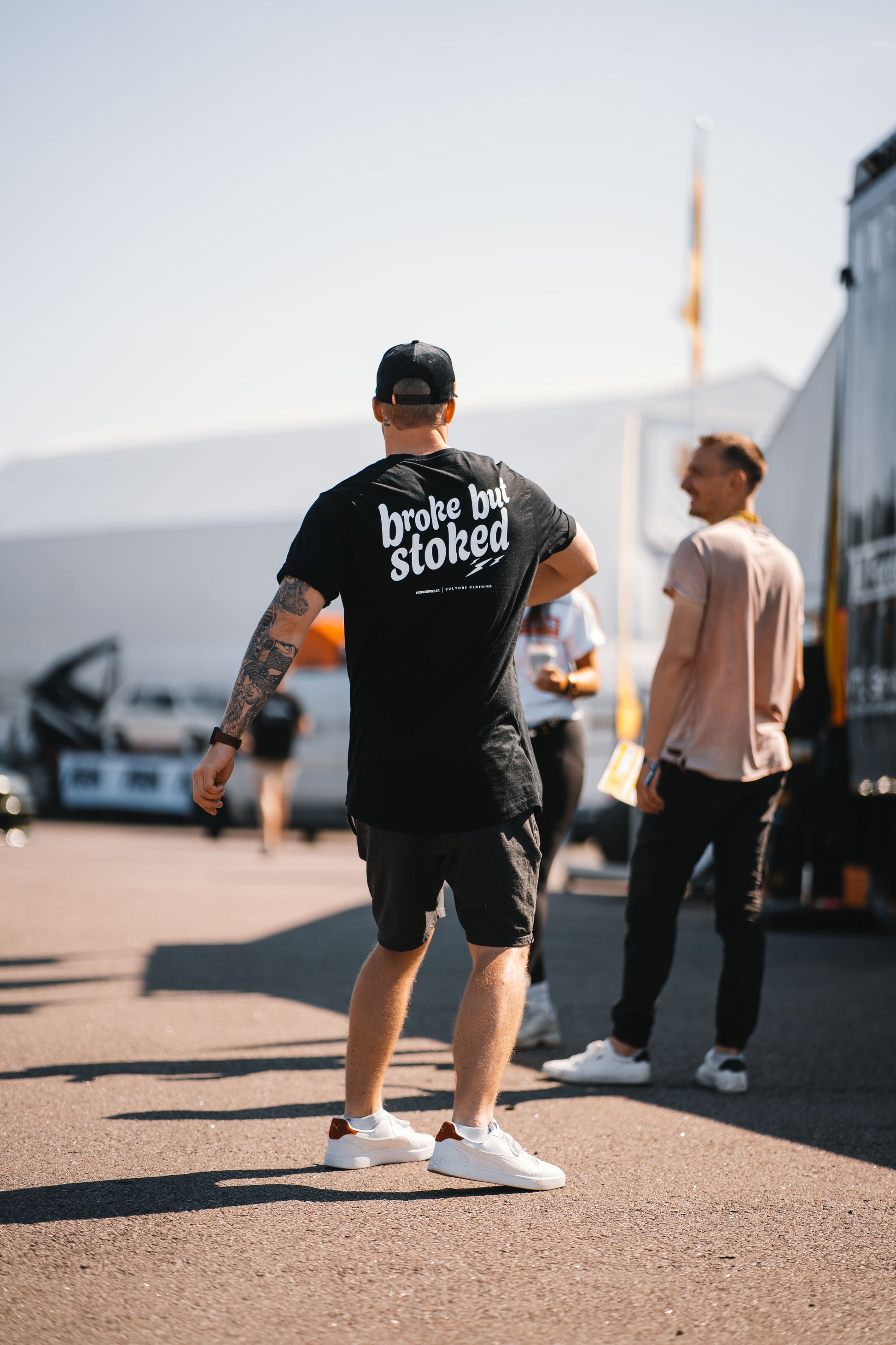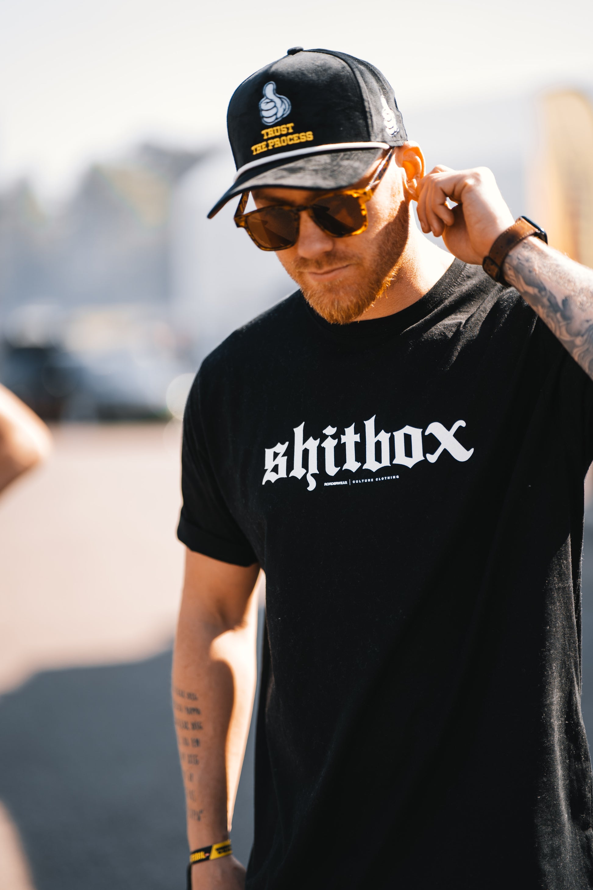 En shoutout till alla budgetbyggen och driftmissiler. Den här svarta versionen med vitt tryck går rakt på sak – "shitbox"fram, "broke but stoked" bak – rensat på bling men full av själ.
