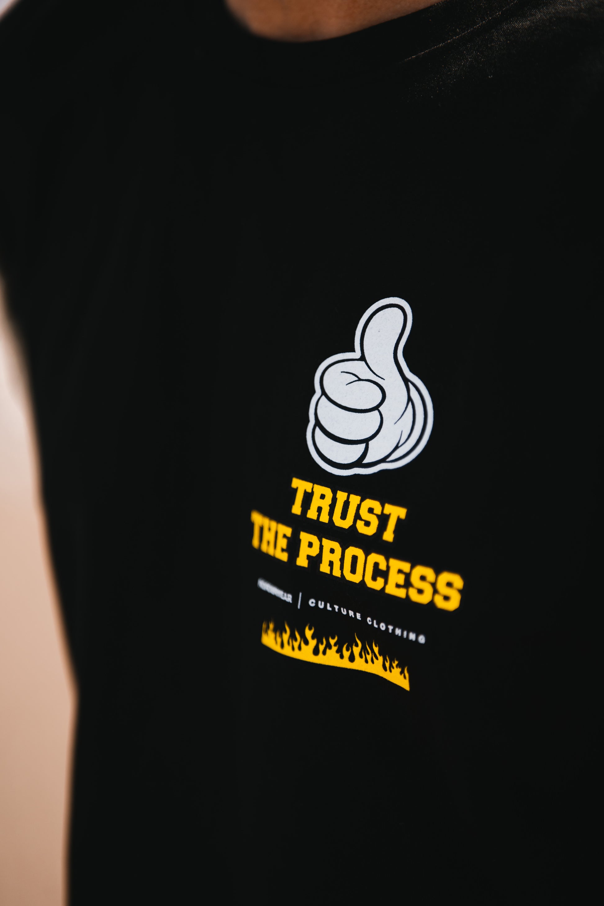 Med handstilscitat, flames och en fet Trust The Process-text mellan två tummar är detta plagget för varje motorintresserad själ som hellre svetsar än viker sig.