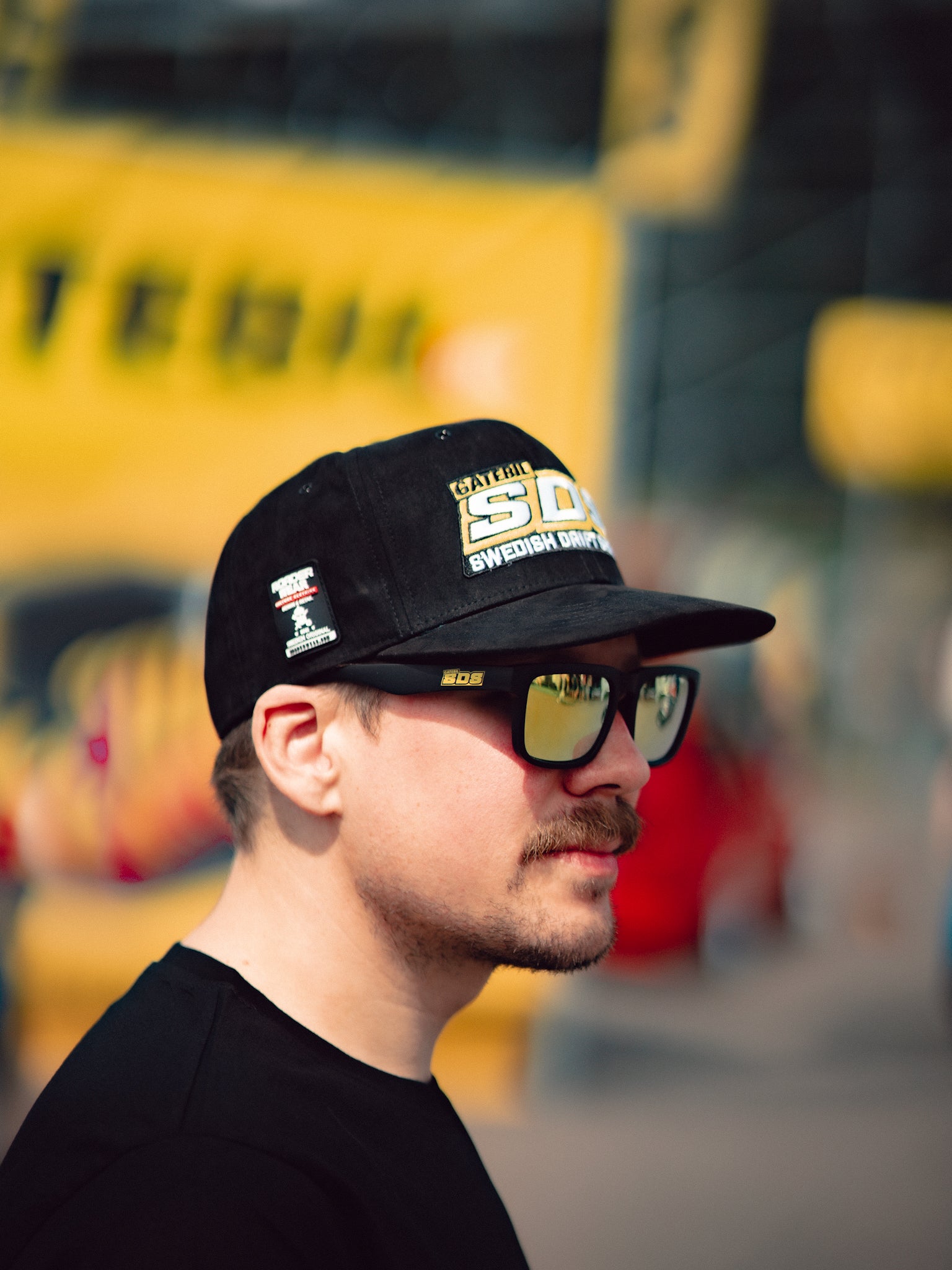 Svarta matta bågar med Gula glas och SDS-loggan på utsidan samt texten Gatebil Swedish Drift Series på insidan av bågarna.